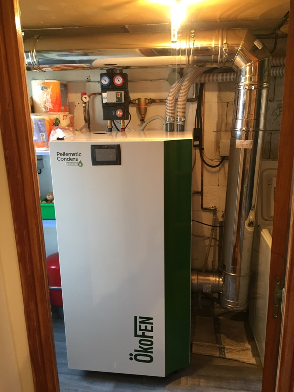 CHaudière Okofen 14KW à condensation, alimentée en pellets via un silo installé dans un cabanon extérieur.  L’ancienne chaudière (électrique) est partie à la casse !! La transition énergétique est en marche à Ennevelin !