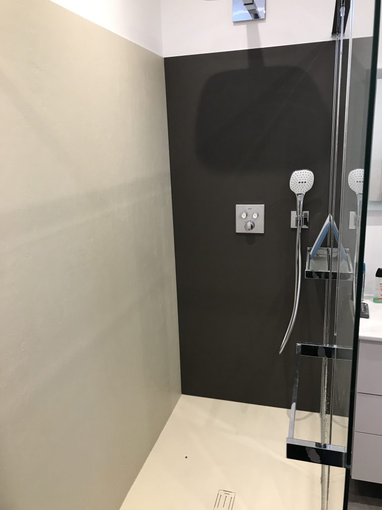 Dépose des anciens appareils sanitaires, modification des réseaux, remplacement de la baignoire par un receveur douche, finition intérieure douche en panneaux composites de couleur. Chantier 2020.